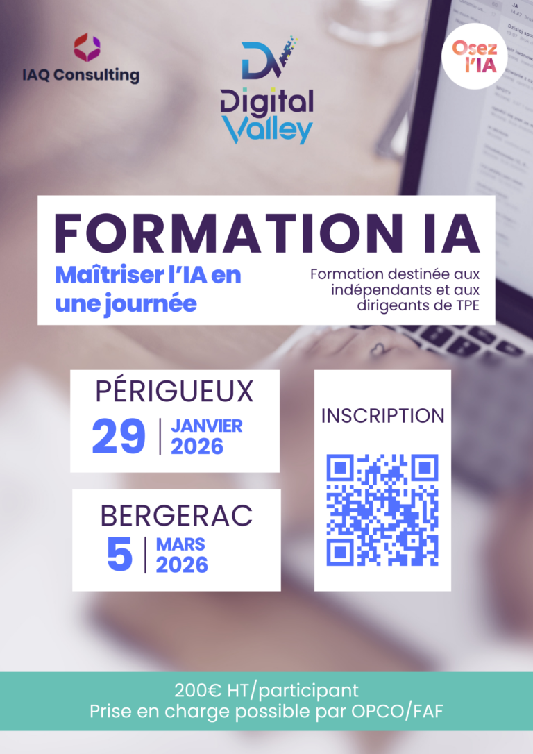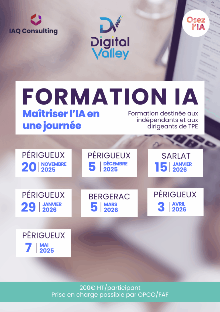 La formation dure 1 journée (9h–17h) , avec un maximum de 10 participants pour favoriser la pratique et l’accompagnement individuel. Les sessions se déroulent en présentiel à Périgueux (Espace Digital Valley), Sarlat (Sarlatech) ou Bergerac.